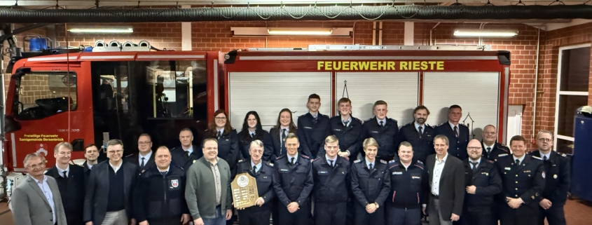 Am Abend des 20 März gab es geradeso genug Stühle im Schulungsraum der Feuerwehr Rieste. Im Obergeschoss des Feuerwehrhauses an der Barlager Straße waren zahlreiche Kameradinnen und Kameraden und Gäste der Einladung von Ortsbrandmeister Sven Kramer gefolgt und versammelten sich zur diesjährigen Jahreshauptversammlung. Um 19:32 Uhr konnte Kramer insgesamt 36 aktive Kameradinnen und Kameraden, 3 Mitglieder der Altersabteilung sowie zahlreiche Gäste von befreundeten Wehren, den Maltesern und der Verwaltung begrüßen. Nach einer Ehrung des verstorbenen Kameraden Ewald Wieghaus und der Abstimmung über das Protokoll aus 2025 fuhr Kramer mit dem Tätigkeitsbericht fort. Die Kameradinnen und Kameraden leisteten im vergangenen Jahr insgesamt 4.351,42 Stunden bei 50 Einsätzen und 62 Dienstveranstaltungen ab.