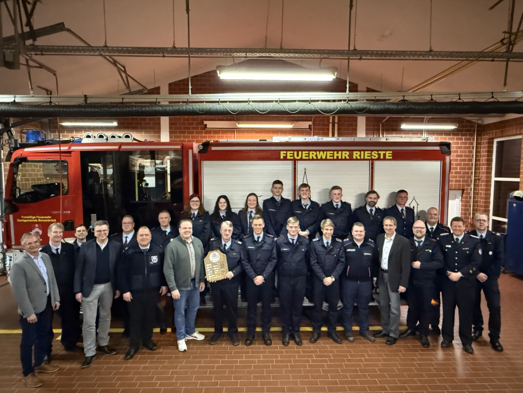 Am Abend des 20 März gab es geradeso genug Stühle im Schulungsraum der Feuerwehr Rieste. Im Obergeschoss des Feuerwehrhauses an der Barlager Straße waren zahlreiche Kameradinnen und Kameraden und Gäste der Einladung von Ortsbrandmeister Sven Kramer gefolgt und versammelten sich zur diesjährigen Jahreshauptversammlung. Um 19:32 Uhr konnte Kramer insgesamt 36 aktive Kameradinnen und Kameraden, 3 Mitglieder der Altersabteilung sowie zahlreiche Gäste von befreundeten Wehren, den Maltesern und der Verwaltung begrüßen. Nach einer Ehrung des verstorbenen Kameraden Ewald Wieghaus und der Abstimmung über das Protokoll aus 2025 fuhr Kramer mit dem Tätigkeitsbericht fort. Die Kameradinnen und Kameraden leisteten im vergangenen Jahr insgesamt 4.351,42 Stunden bei 50 Einsätzen und 62 Dienstveranstaltungen ab.