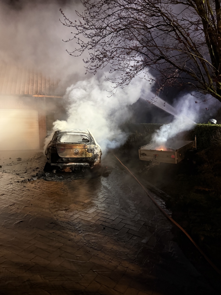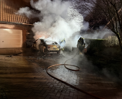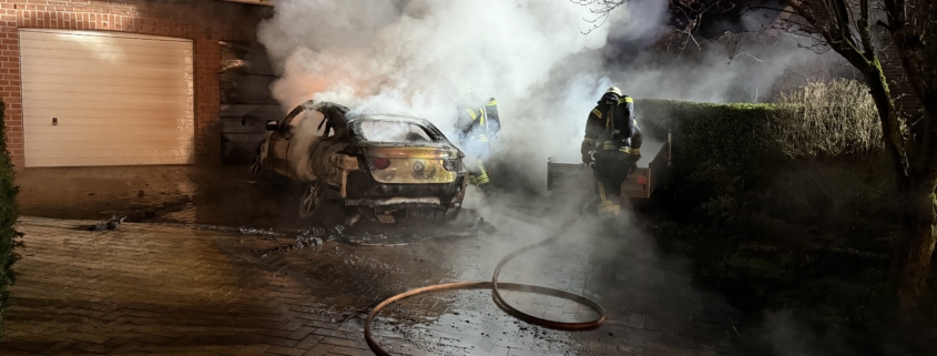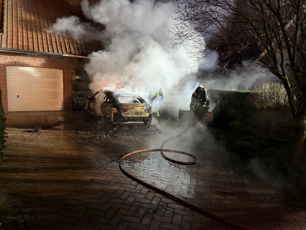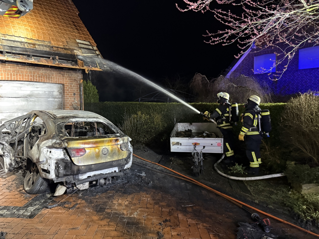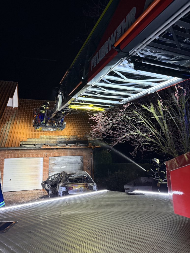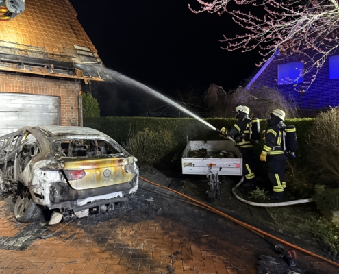 Bereits auf der Anfahrt wurde durch die Regionalleitstelle in Osnabrück die Feuerwehr Alfhausen hinzugezogen, da durch mehrere Anrufer ein drohendes Umschlagen der Flammen auf das Wohnhaus drohte. Bei Eintreffen der ersten Kräfte stand der PKW bereits in Vollbrand und die Garage des Hauses war bereits deutlich von Hitze und Flammen gezeichnet. Ein Trupp unter Atemschutz begann mittels Schnellangriff umgehend mit den Löscharbeiten, ein zweiter Trupp richtete eine Riegelstellung zum Gebäude ein. Durch das schnelle Eingreifen und die solide Bauweise konnte der Schaden am Gebäude deutlich beschränkt werden.