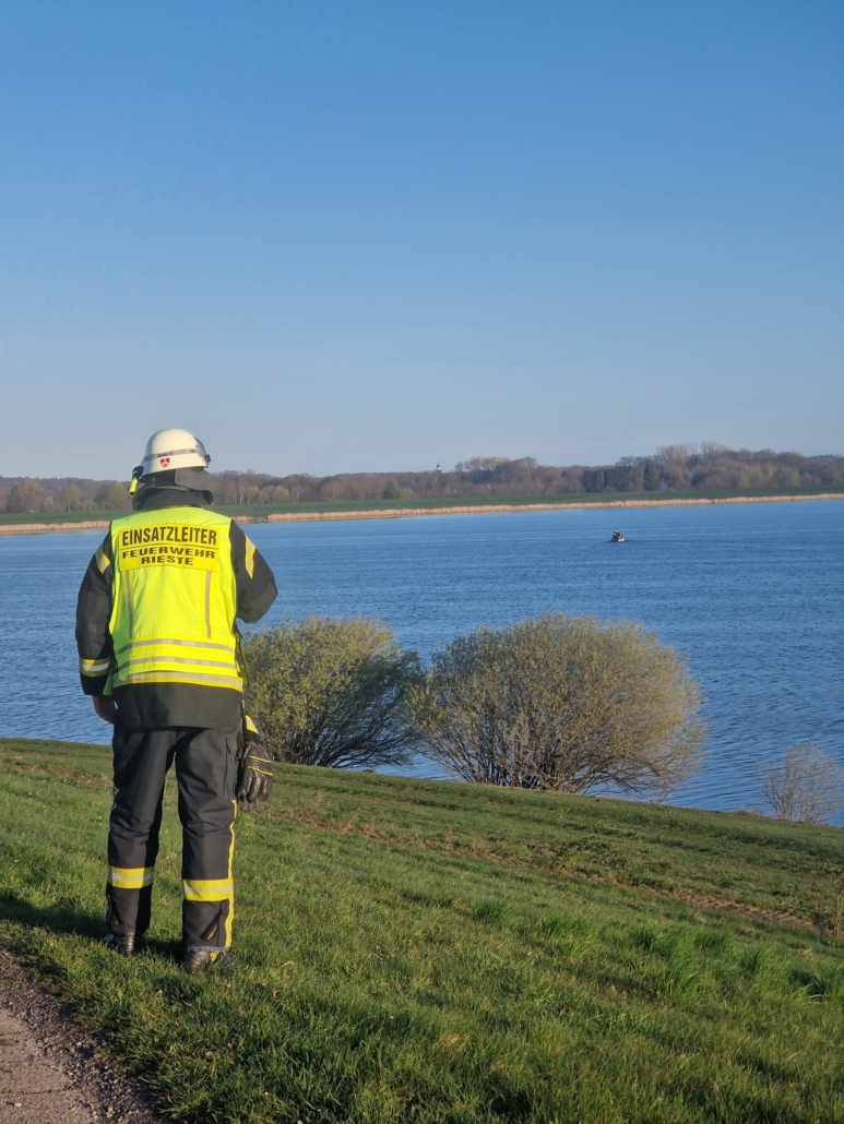 Am frühen Ostermontag wurde die Feuerwehr Rieste gemeinsam mit diversen Wasserrettungseinheiten und dem Rettungsdienst an den Alfsee alarmiert. Im Rahmen einer polizeilichen Maßnahme hatte eine Person versucht zu fliehen und fand sich mitten im Alfsee wieder. Der See jedoch war recht zügig umstellt und die Person zeigte keine Absichten freiwillig ans Ufer zu kommen. Bei den aktuellen Wassertemperaturen war jedoch auch diese Situation nicht ungefährlich für den Betroffenen. Die Tauchergruppen aus Alfhausen und Epe/Sögeln ließen jeweils ein Boot zu Wasser welche mit 2 Tauchern und 2 Polizisten besetzt wurden. Die Person wurde aus dem Wasser gerettet und am Ufer dem Rettungsdienst und der Polizei übergeben. Weitere Einsatzkräfte der DLRG Quakenbrück konnten die Einsatzfahrt abbrechen. Für die insgesamt rund 60 Kräfte unter der Leitung von Ortsbrandmeister Sven Kramer war der Einsatz nach gut 90 Minuten beendet.